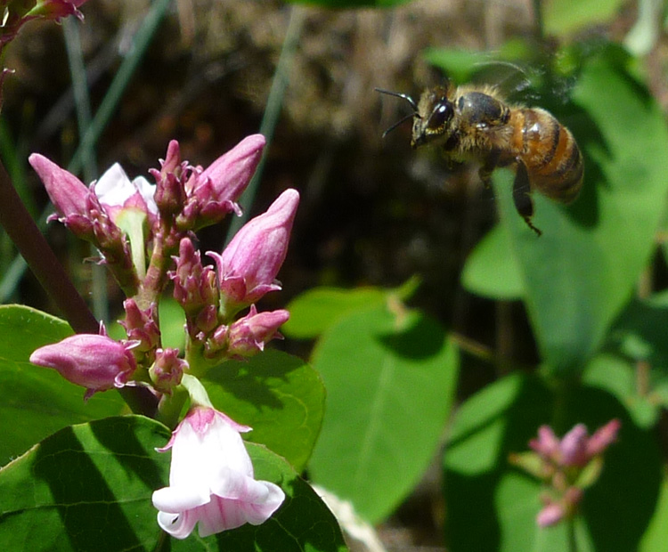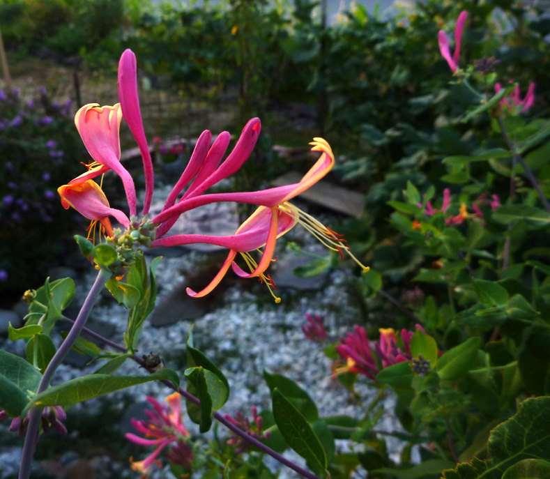 My neighbor's honeysuckles, backlit by an orange sunset: